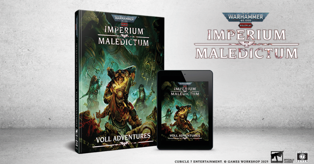Walk into the office where I record our actual plays, and you’ll see over 29 Warhammer Fantasy Roleplay 4th Edition books lining my game shelves. At seven years old, the system has a tremendous wealth of content, both in print and PDF format. Imperium Maledictum, having just turned two, has a smaller but growing footprint. With the release of Voll AdventuresImperium Maledictum will now have four physical books out in the galaxy, and it is quite obvious that Cubicle 7 is nowhere near done with this system.